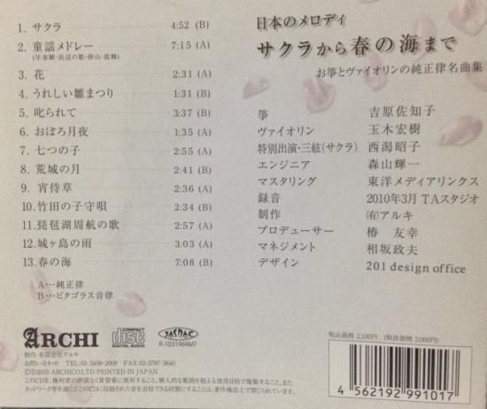 投稿日: 2026年1月24日2026年1月29日 投稿者: admin日本のメロディ サクラから春の海まで CD型番:ARCH 11001単価:2,100円(税込) 「お箏とヴァイオリンによる日本のメロディ」 【サクラから春の海まで】 吉原佐知子(お箏)玉木宏樹(ヴァイオリン・編曲) ご注文はこちら 商品名: 単価: 数量: —以下から選択してください—12 ※恐れ入りますが、数量に限りがございますので、ご注文は1品目2(枚・冊)まででお願いいたします。 ※配送料(500円)及び振込手数料はお客様のご負担となります。 お買上げ金額と配送料の合計金額(振込手数料を除く): ※送信後に当会からメールが自動返送されます。 ※その自動返信メールに記載された振込先に「お買上げ金額と配送料の合計金額」をお振込み下さい。 ※お振込期限は本日から3日以内とし、遅れた場合はご注文はキャンセルになります。 ※お振込みを確認次第、商品を発送いたします。 お名前: ご送付先: メールアドレス: メッセージ 特定商取引法に基づく表記を確認し、同意しました Δ Post Views: 45