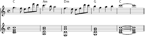 上記のCチューニング純正律には,ハ短調の曲における主要三和音,Cmコード(C-E♭-G),Fmコード(C-F-A♭),Gmコード(D-G-B♭)も含まれていることが分かります。また,これらの音を音階の順に並べると,以下のようになります。