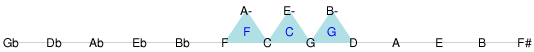 和音を構成する音の周波数関係が単純な整数比であるとき,純正なハーモニーが得られます。このような考え方で作られた音律を純正律といいます。例えば,ハ長調の曲における主要三和音は,Cコード(C-E-G),Fコード(C-F-A),Gコード(D-G-B)であり,これらの和音を純正に演奏するには,ピタゴラス音律の “E,A,B”の音を若干低めに取る必要があります。これらの音は,前回示したピタゴラス音律の直線上に存在しないので,それぞれの和音が正三角形を成すように“E-,A-,B-”をプロットすると,下記のようになります。