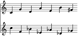 次に“G”の音に対して3/2の周波数関係となる“D”の音が導かれます。なお,オクターブ内に収まるように,適宜オクターブ上げ下げすると良いでしょう。この作業を繰り返すと“A→E→B→F♯”の音が得られます。今度は反対に,基準となる“C”音に対して2/3の周波数関係となる純正な完全五度下の音を決めていくと“F→B♭→E♭→A♭→D♭→G♭”の音が得られます。