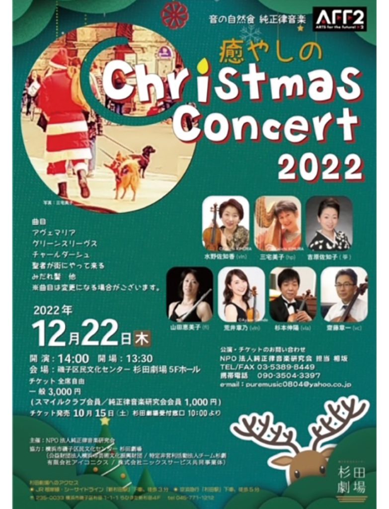 投稿日: 2026年1月29日2026年1月30日 投稿者: admin癒やしの Christmas Concert 2022 音の自然食 純正律音楽研究会「癒やしの Christmas Concert 2022」 2022年12月22日磯子区民文化センター 杉田劇場 5F ホール Post Views: 58